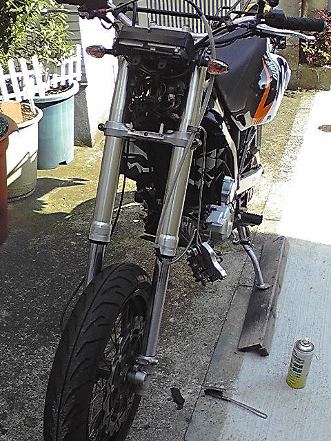 本日のメニューはフロントフォークオイルの交換。一年ぶりだったので、ちょっと忘れてるかも・・不安におもいつつも、がんばって空けた時間を有効に使います。
