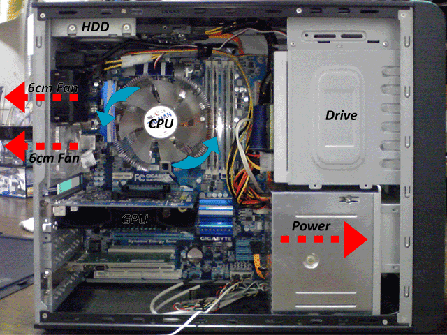 排気は6cmファン2機と電源についてるファンのみ。